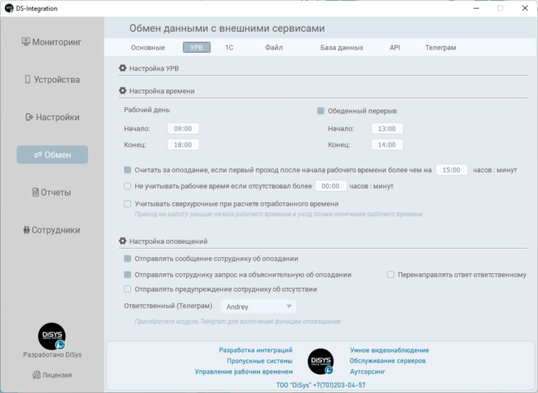 Интеграция собирает данные о проходах с устройств, аккумулирует полученные данные, делает расчеты согласно рабочему времени и отправляет эти данные во внешние сервисы.